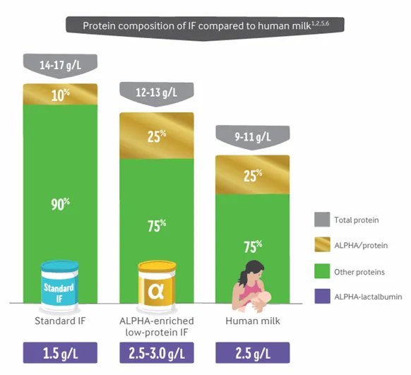 α-乳白蛋白是母乳中含量最高的蛋白质,约占总蛋白的25%,但在牛乳中含量较低,如图表1-5所示。富集α-乳白蛋白是实现婴幼儿配方奶粉母乳化的关键步骤,也是当前生物制造技术竞争的制高点。