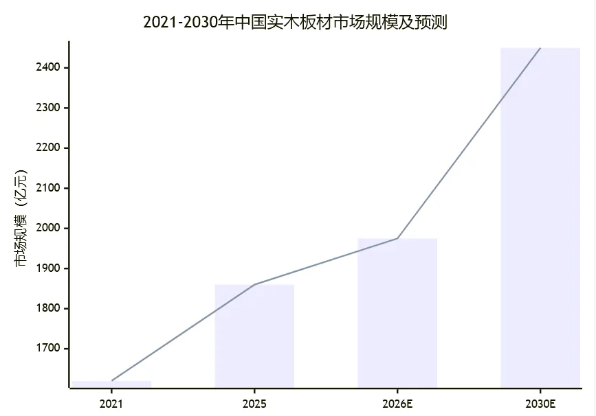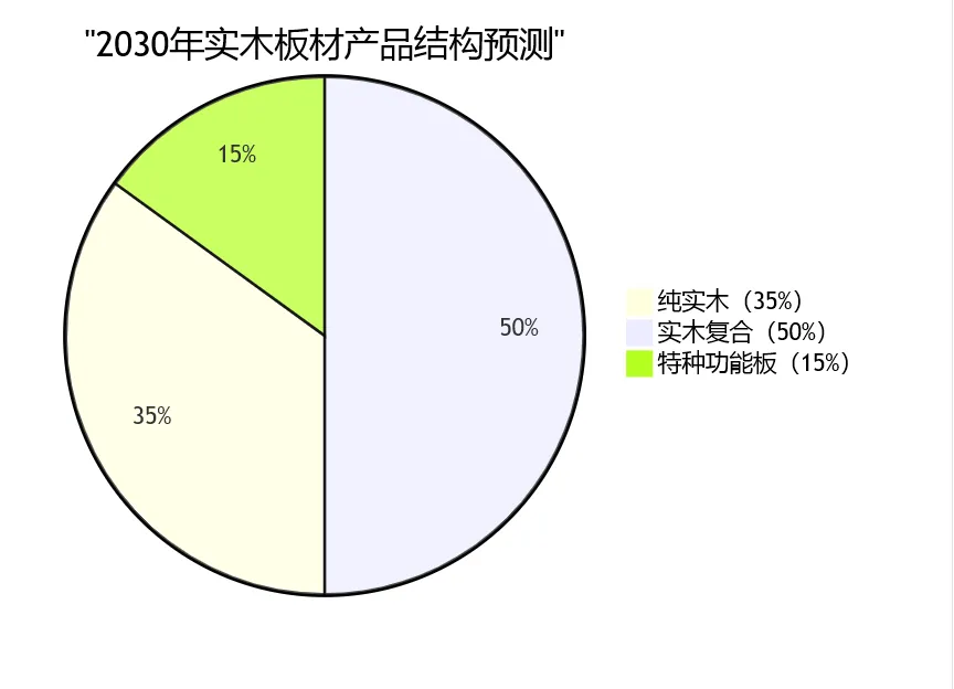 2026年,国内实木板材市场规模预计达到1950-2000亿元,同比增速维持在5.7%-8.3%,行业逐步摆脱短期成本压力,实现平稳增长。到2030年,市场规模预计突破2400-2500亿元,2026-2030年复合增速稳定在5.8%-6.5%,行业增长确定性较强。产品结构持续优化,2030年预计形成纯实木(35%)、实木复合(50%)、特种功能板(15%)的格局,高端实木板材占比持续提升,产品附加值不断提高。(二)五大核心趋势