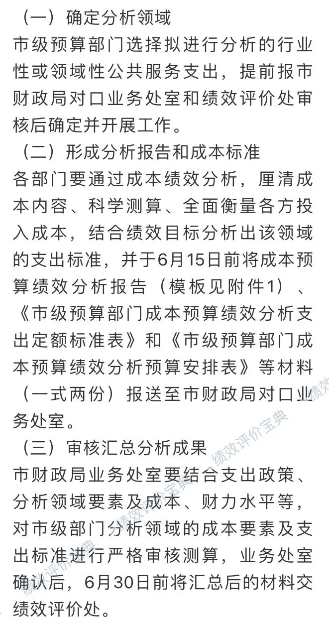 建议各区各部门优先选择体现本行业本领域职责特点、有一定历史支出数据、市场或相关行业标准数据可得、支出内容可量化的领域开展成本绩效分析。财政部门已经制定通用标准的领域不需进行成本绩效分析。如市级部门及所属单位的全部支出均已有国家或我市统一支出标准作为支出依据的,经市财政局确认后,可不开展成本预算绩效分析。