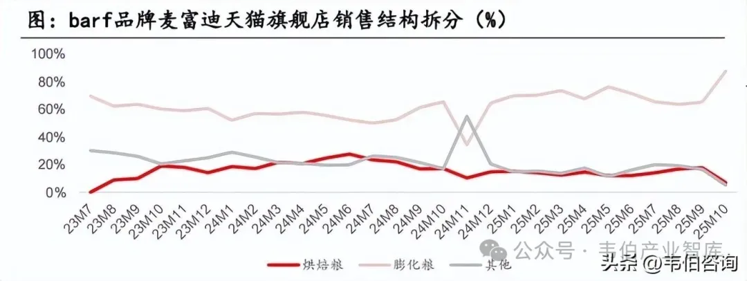 整体结构升级趋势明显:1)膨化粮向烘焙粮升级,烘焙粮25M10淘系渠道规模保持三位数增长,占比加速提升;2)膨化粮内部向中高端升级(成熟老品牌内部),如麦富迪品牌内部barf占比提升。