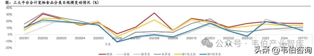 “双十一”期间,宠物食品行业仍保持双位数增长,宠物增速好于整体大盘增速,根据久谦数据,10月宠物大盘规模同比+19%,天猫/京东/抖音分别同比+15%/+21%/+29%,分别占比57%/22%/21%