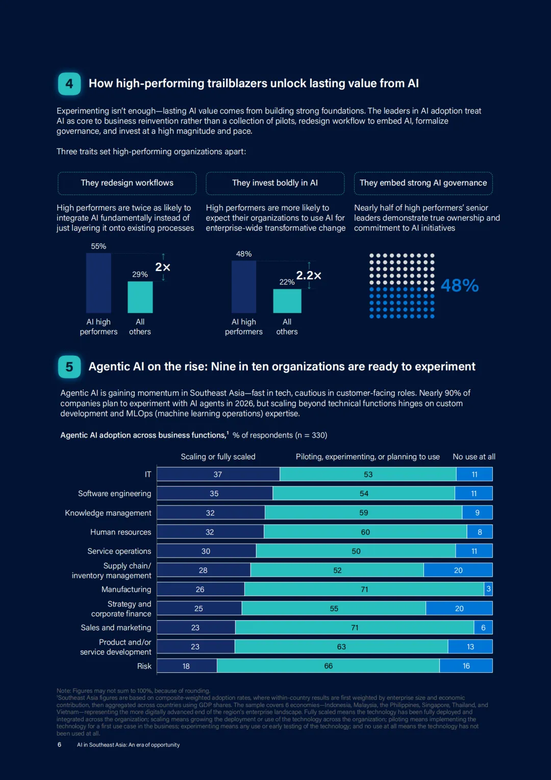 关键数据直观印证行业格局:东南亚 380 万 35 岁以下年轻人口构成数字基底,70% 民众对 AI 持积极态度;人才短缺(20%)、系统集成复杂(16%)、ROI 不清晰(12%)是企业落地三大核心障碍;仅 6% 高绩效企业实现 AI 显著盈利,这类企业重构工作流程的比例是普通企业的 2 倍,高管投入度与战略决心成为核心分水岭。