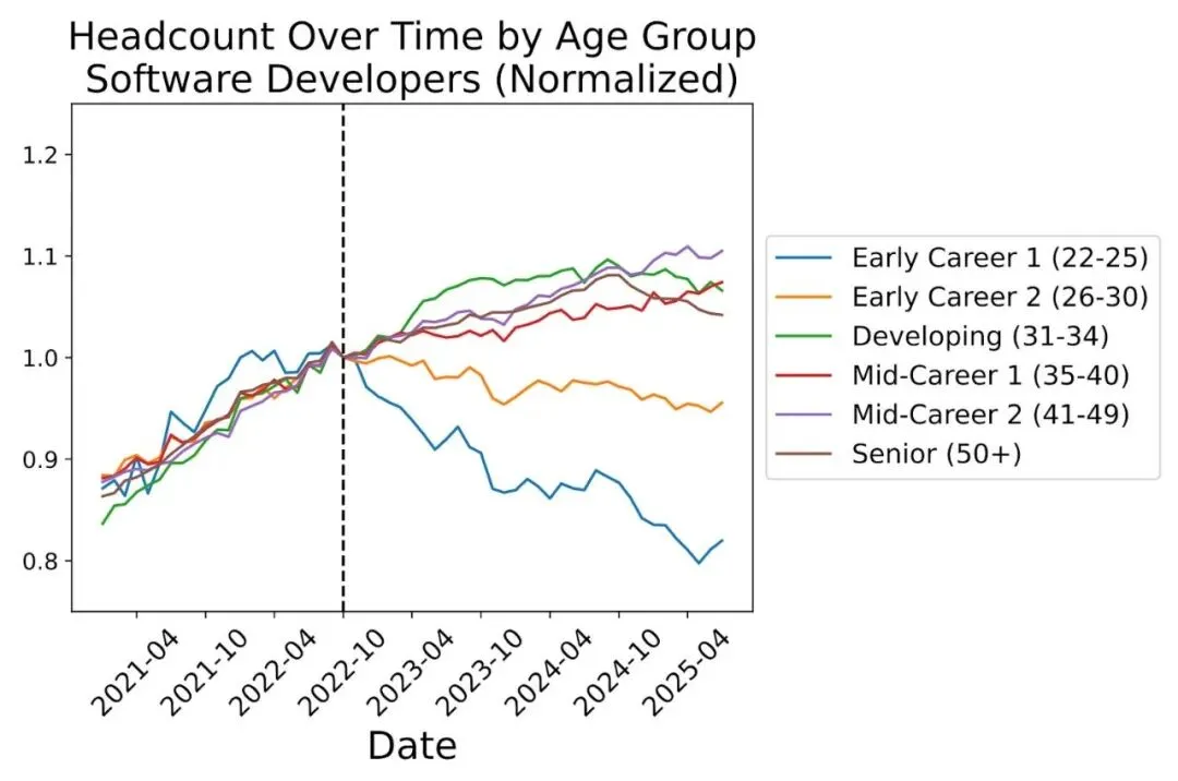 初级开发者的处境已经相当难看。CIO报道引述多位技术主管的判断:AI编程工具的能力提升,让一名资深工程师现在能完成过去需要三四个人的工作量。初级工程师的招聘正在系统性收缩,部分公司直接宣布暂停应届生批量录用。