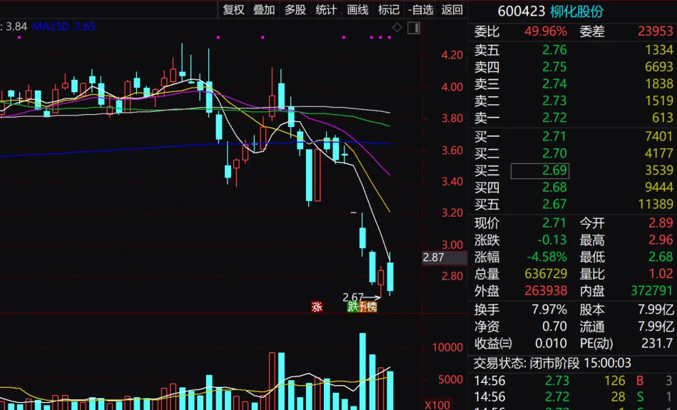 敏感的资本市场迅速做出反应。4月13日一开盘,柳化股份就被死死地摁在了跌停板上。此后,柳化股份遭遇了连续大跌,最低探至2.67元,接近历史最低价区域。截至4月17日收盘,其股价为2.71元/股,下跌4.58%,日k线呈现单边下跌趋势,尚未有止跌企稳迹象。