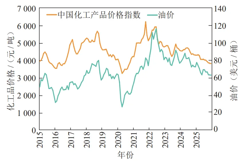 近年来,国内大宗化学品价格与国际原油价格的相关性显著减弱,传统的“油价主导”定价模式正在发生深刻转变。特别是2022年以来,受俄乌冲突等地缘政治风险等因素影响,国际油价一度突破100美元/桶,带动全球大宗商品价格快速上涨。然而,国内石化产业链的盈利水平并未同步改善,反而因成本大幅攀升而承受巨大压力,行业利润整体下行甚至出现亏损。两者的相关系数跌至0.1左右,远低于0.6~0.9的历史平均水平。造成这种“脱钩”现象的核心原因在于供需结构的失衡。从供应端看,高油价直接推高了石脑油等基础原料价格,使以石脑油为路线的乙烯等装置生产成本大幅攀升。但从需求端看,受疫情等因素制约,国内消费增长动力不足,同时大量新增产能集中投放,使得消费增速远低于供给增速,“高成本、弱需求、强供给”格局导致产业链成本传导机制受阻。下游行业对高价原料的接受度有限,石化产品价格上涨乏力,石脑油—乙烯裂解价差长期徘徊在200美元/吨低位,甚至出现倒挂,众多一体化及下游化工企业陷入阶段性持续亏损。此现象表明,国内石化产品定价机制已由“成本推动”主导,逐步转变为由“成本支撑”、“供需基本面”与“国内产能结构”多重因素共同主导的复杂博弈格局。2015—2025年布伦特油价走势见图1,2000—2025年石脑油和乙烯价格走势见图2。