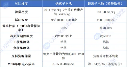 图表:钠离子电池与锂离子电池关键性能及成本对比