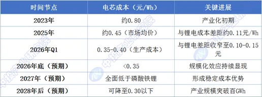 在成本方面,据中科海钠披露,钠离子电池电芯成本已从2023年的0.8元/Wh快速降至2026年第一季度的0.35-0.40元/Wh,能量密度同步提升,应用场景加速扩容。