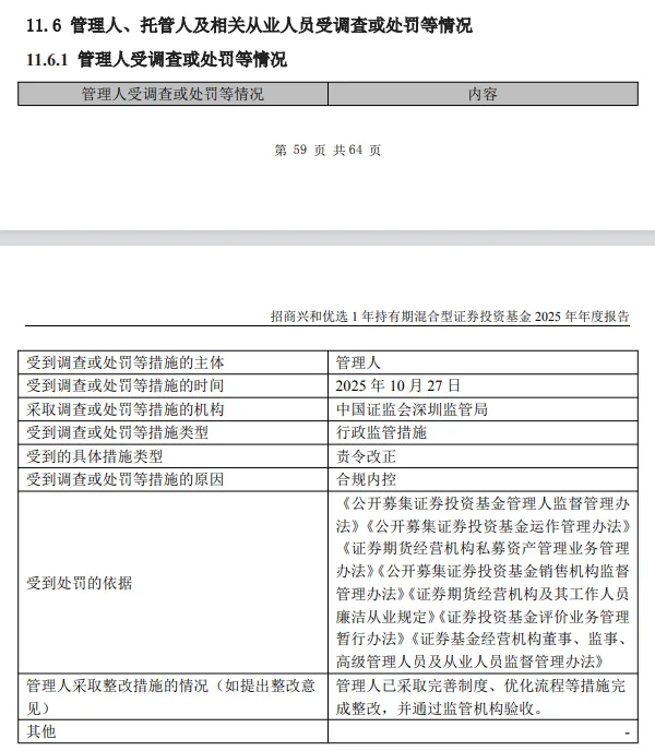 2025年,招商基金也因合规内控问题被处罚。公告显示,2025年10月27日,中国证监会深圳监管局因合规内控对招商基金采取行政监管措施,要求公司责令改正。招商基金高管因合规内控问题被监管谈话。