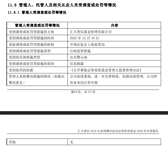 2025年12月16日,汇丰晋信基金因信息披露原因被中国证监会上海监管局采取行政监管措施,被出具警示函。