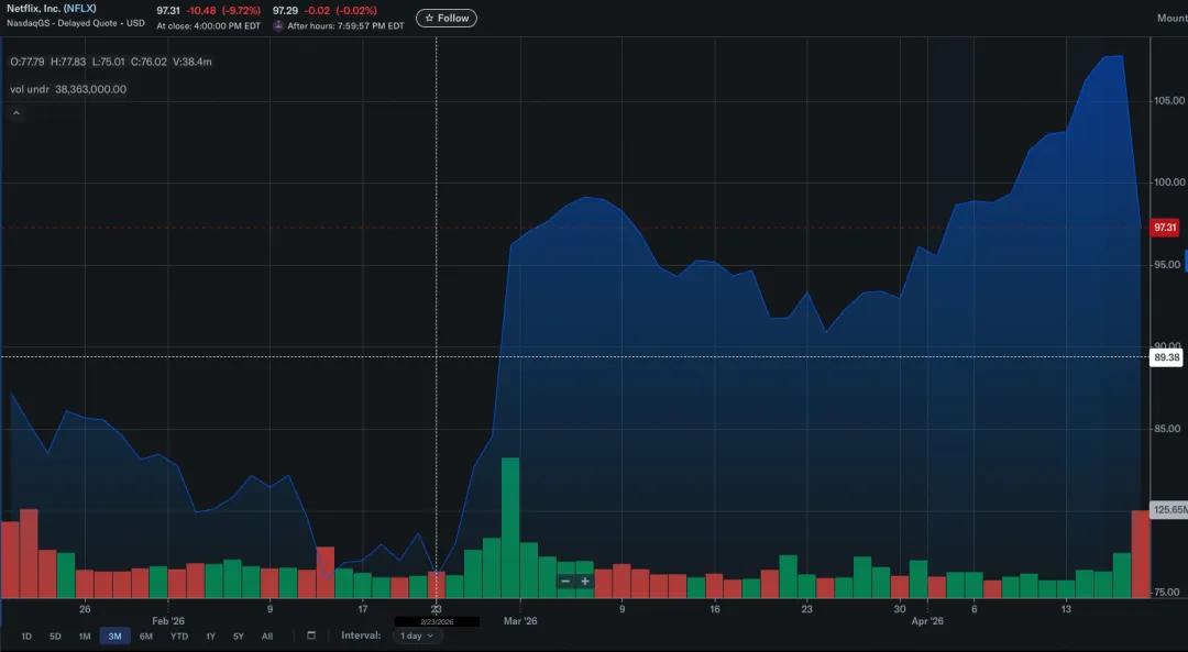 从 2 月底到 4 月 16 日财报发布,Netflix 股价上涨了 40% 以上。这 40% 里定价的,就是这套"定价权 + 广告业务 + 回归基本盘"的三位一体叙事。