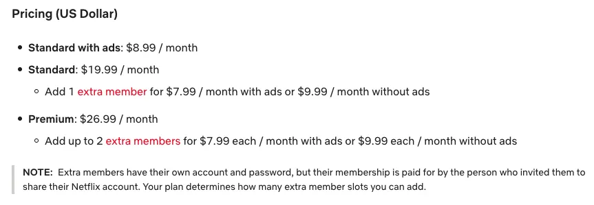3 月中旬,Netflix 对美国市场的订阅套餐做了一次全面涨价:广告版套餐维持 8.99 美元不变,无广告标准版从 17.99 美元涨到 19.99 美元,无广告高级版从 24.99 美元涨到 26.99 美元。