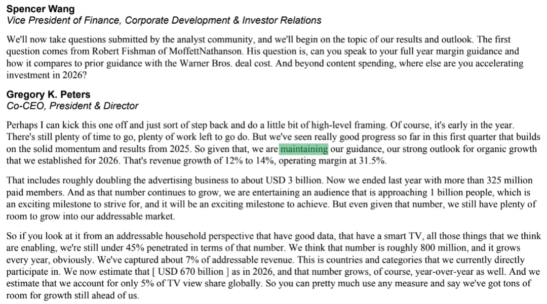 Co-CEO Greg Peters 在回答 MoffettNathanson 的 Fishman 关于全年指引的第一个问题时,给出了一个看起来完全正常的回答:公司维持 2026 年的全年营收指引在 507 亿到 517 亿美元,对应 12% 到 14% 的同比增速;维持全年营业利润率目标在 31.5%;维持广告收入翻倍到约 30 亿美元的预期。