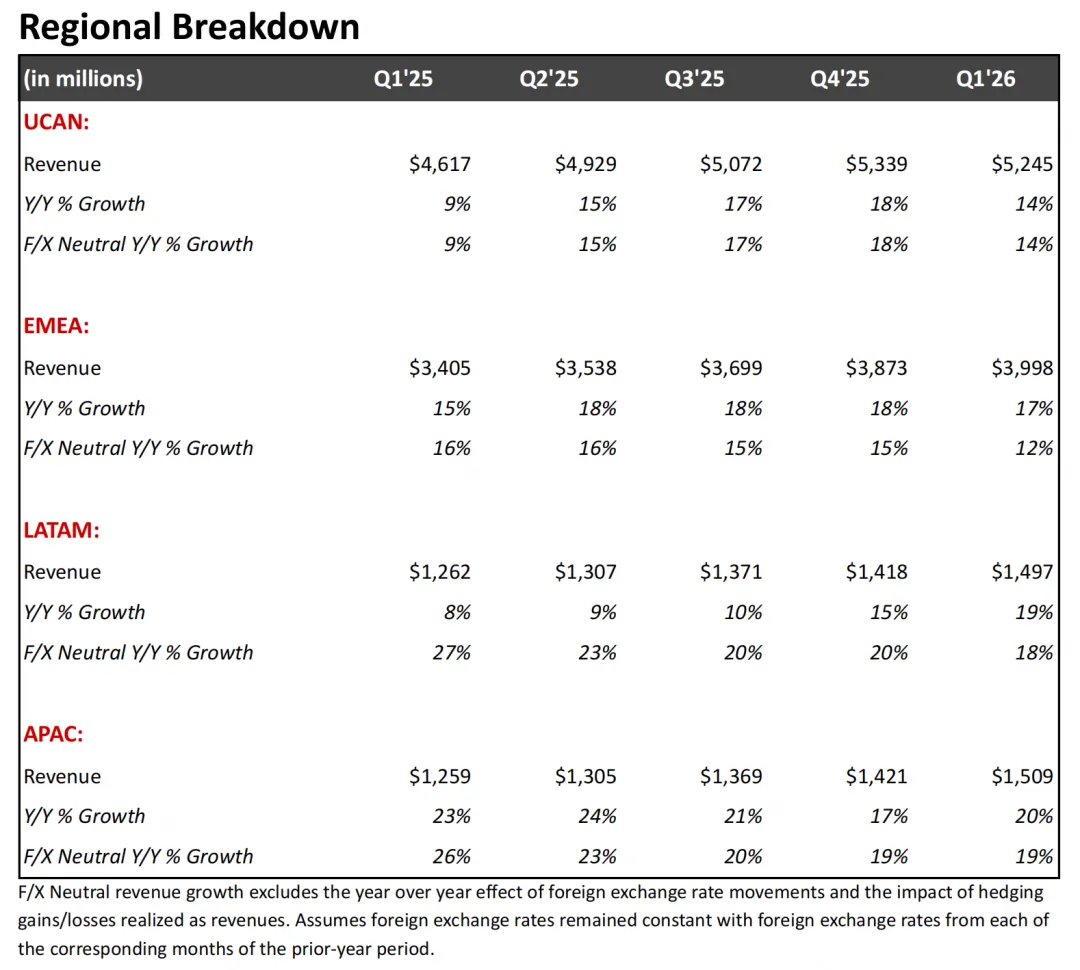 Netflix 把全球收入拆成 UCAN(美国 + 加拿大)、EMEA(欧洲 + 中东 + 非洲)、LATAM(拉美)、APAC(亚太)四个区域。Q1 2026 的区域营收数据是这样的: