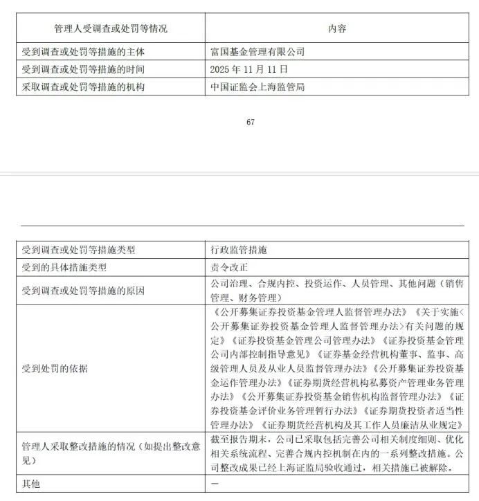富国基金在公告中披露,截至报告期末,公司己采取包括完善公司相关制度细则、优化相关系统流程、完善合规内控机制在内的一系列整改措施。公司整改成果已经上海证监局验收通过,相关措施已被解除。