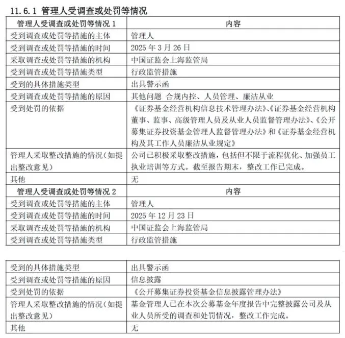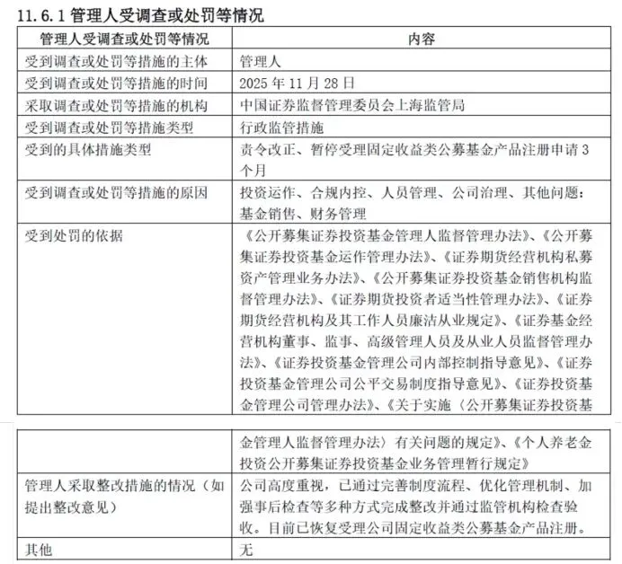 值得关注的是,2025年12月23日,西部利得基金再度因信息披露违规被中国证监会上海监管局出具警示函,受到处罚的依据为《公开募集证券投资基金信息披露管理办法》。
