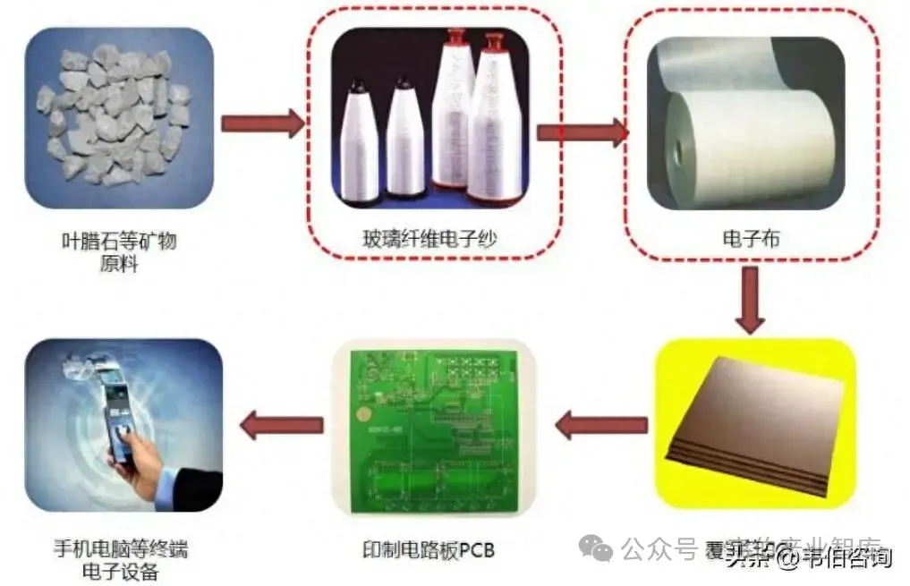 在应用端,电子布与树脂浸胶压合制成覆铜板(CCL),进而加工成印制电路板(PCB),最终广泛落地于消费电子、通信服务器、汽车电子及航空航天等核心终端。