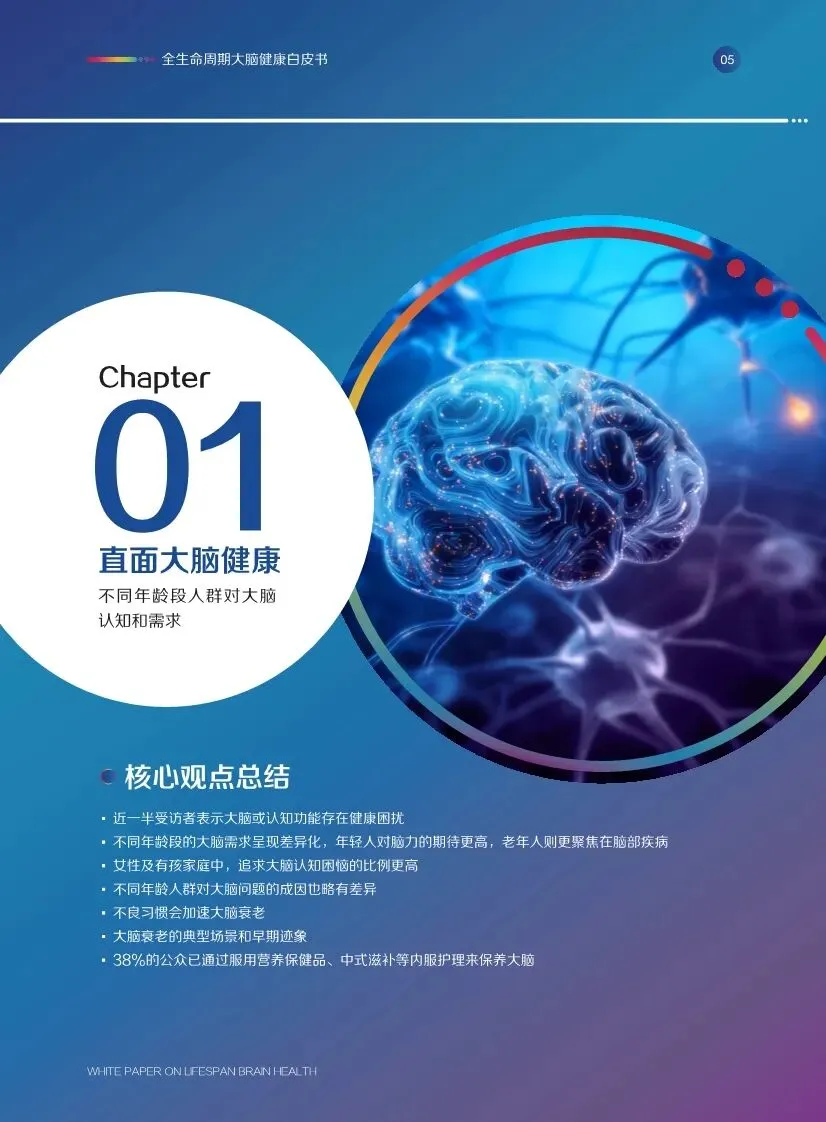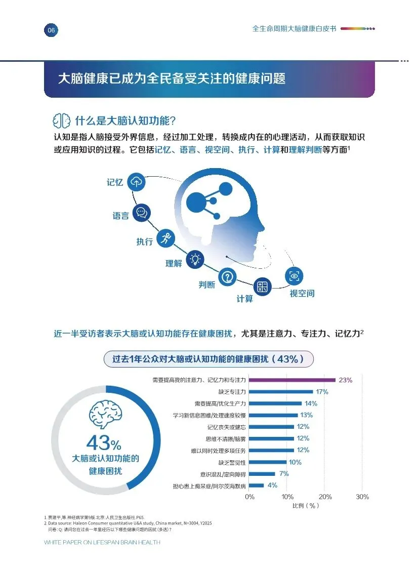 “脑子不够用”、“经常忘事”、“注意力涣散”……这些困扰并非老年人专属,而是贯穿全生命周期的脑健康挑战。这份由权威专家指导、基于3000多名公众调研的白皮书,首次系统提出“全生命周期大脑健康”理念,并用数据揭示:近一半受访者(43%)正受大脑认知问题困扰。一场覆盖营养、锻炼、生活方式的“脑力保卫战”,需要从青年时期就开始布局。