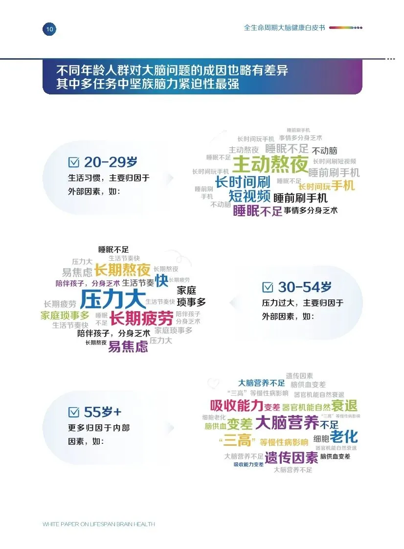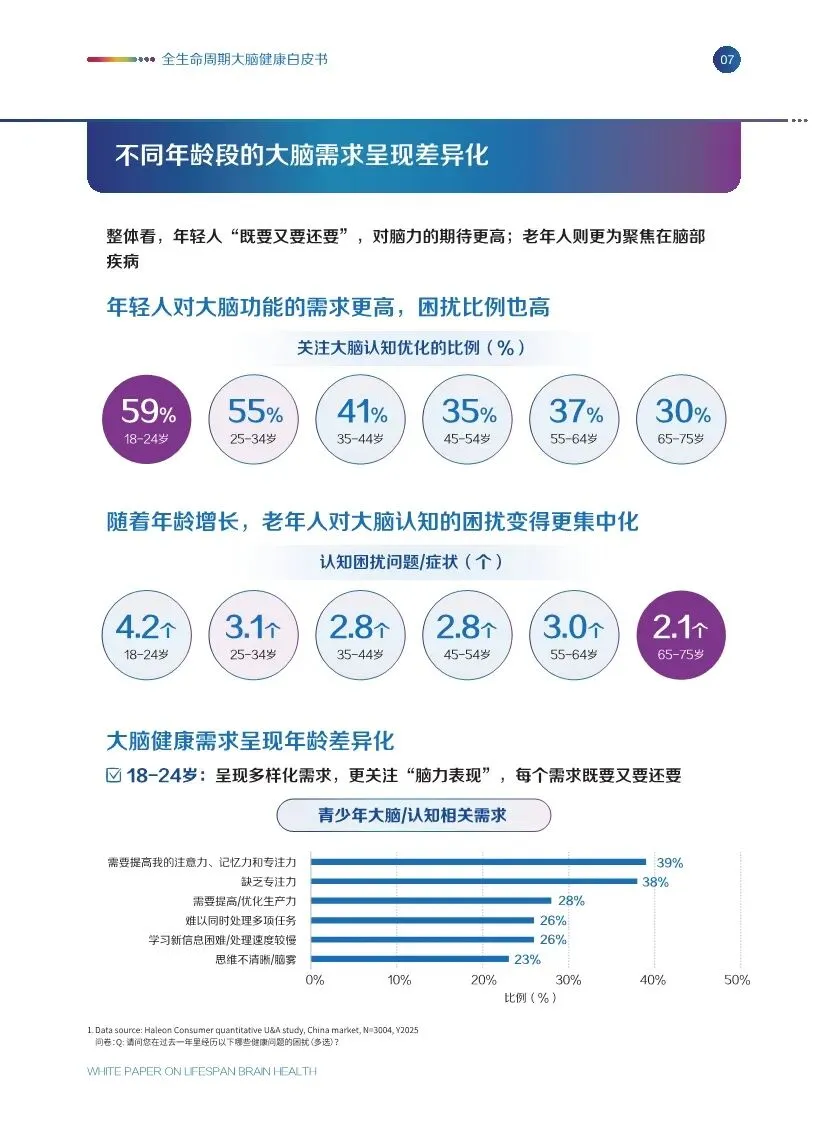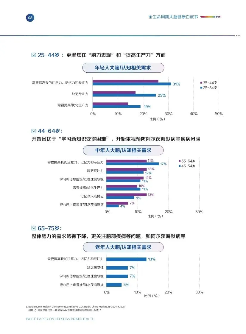 需求演变:25-44岁更关注“脑力表现”与生产力;45-64岁开始担忧学习新知识困难与阿尔茨海默病风险;65岁以上则更聚焦于脑部疾病本身。
