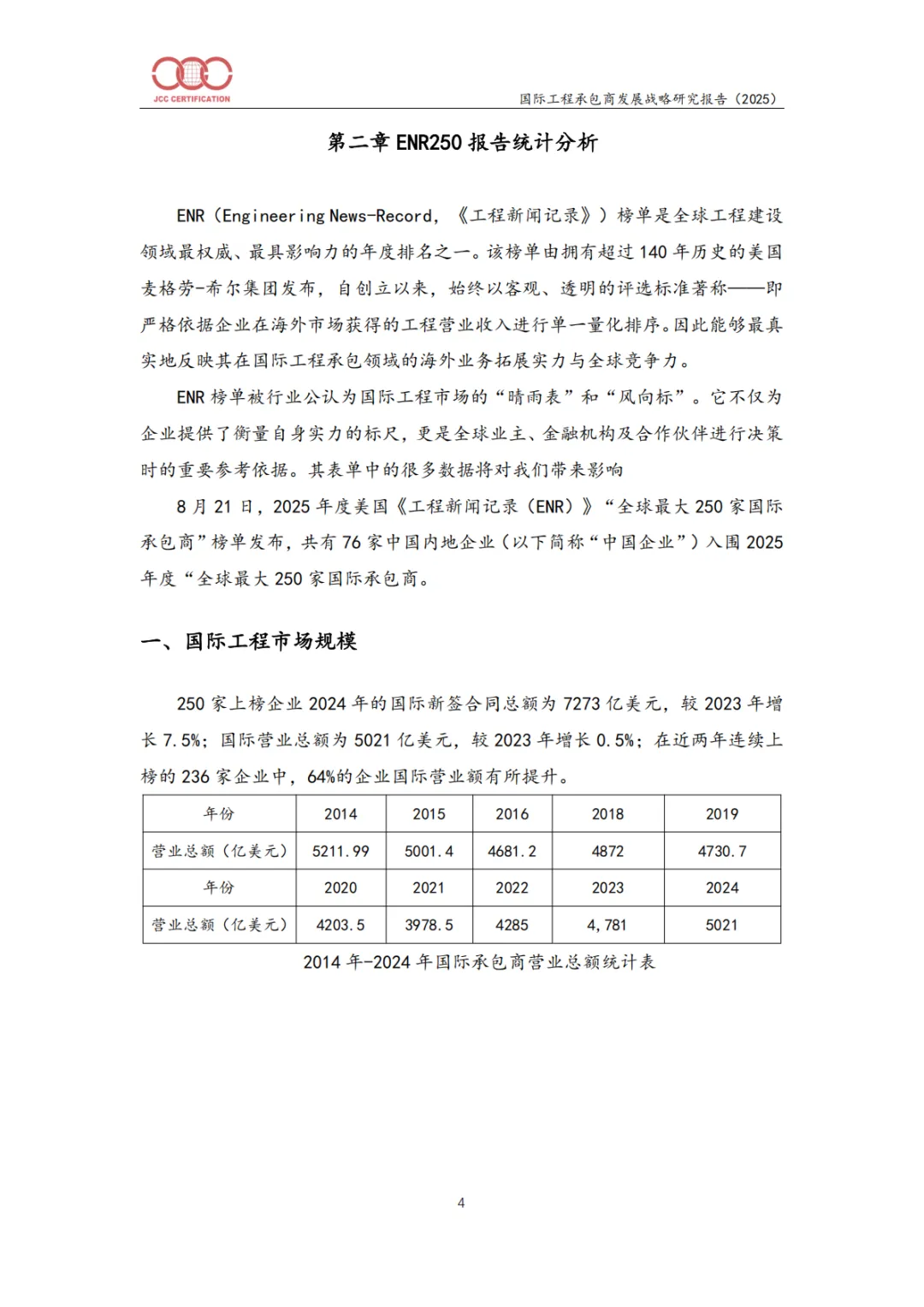 报告揭示,国际工程市场已告别“黄金十年”,进入总量约6000-7000亿美元、增速平缓的“新常态”。2024年国际营业总额5021亿美元,仅微增0.5%,市场在波动中趋于稳定。
