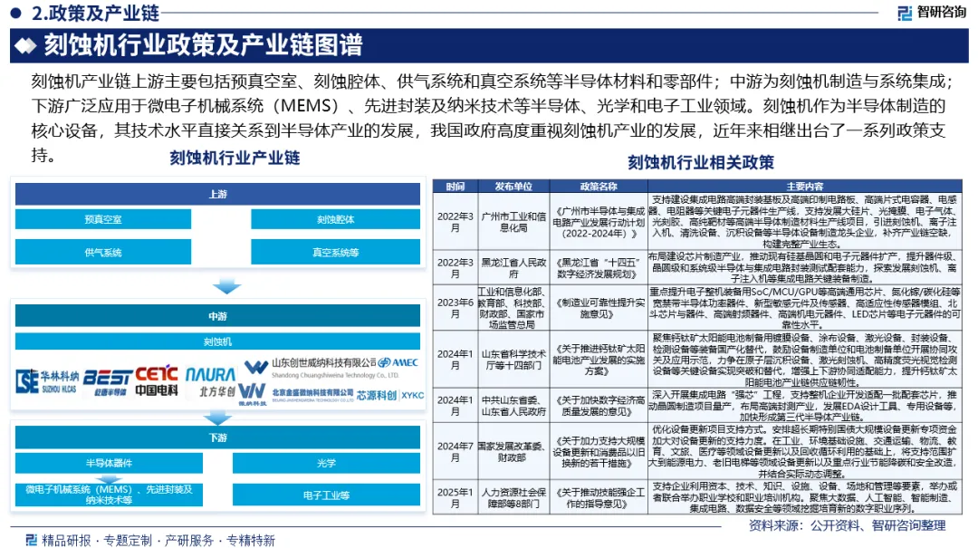行业政策环境:刻蚀机作为半导体制造的核心设备,其技术水平直接关系到半导体产业的发展,我国政府高度重视刻蚀机产业的发展,近年来相继出台了一系列政策支持。如《广州市半导体与集成电路产业发展行动计划(2022-2024年)》《制造业可靠性提升实施意见》《关于推动技能强企工作的指导意见》等。