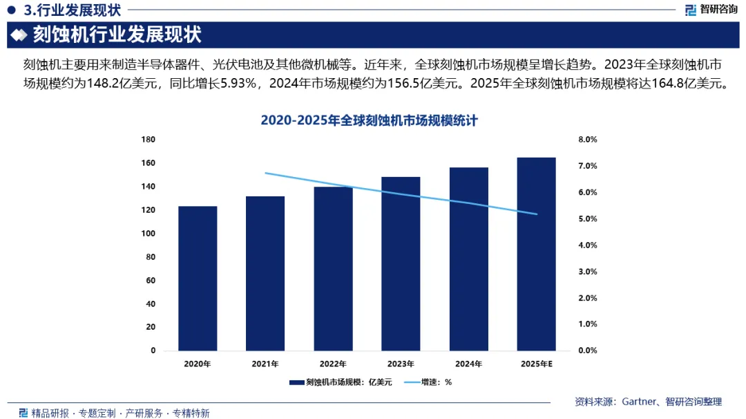 刻蚀机是一种用于半导体制造的工艺试验仪器,它通过将化学反应物和物理能量相结合,去除材料表面的一部分,从而创建所需的微细结构,主要用来制造半导体器件、光伏电池及其他微机械等。近年来,全球刻蚀机市场规模呈增长趋势。2023年全球刻蚀机市场规模约为148.2亿美元,同比增长5.93%,2024年市场规模约为156.5亿美元。2025年全球刻蚀机市场规模将达164.8亿美元。
