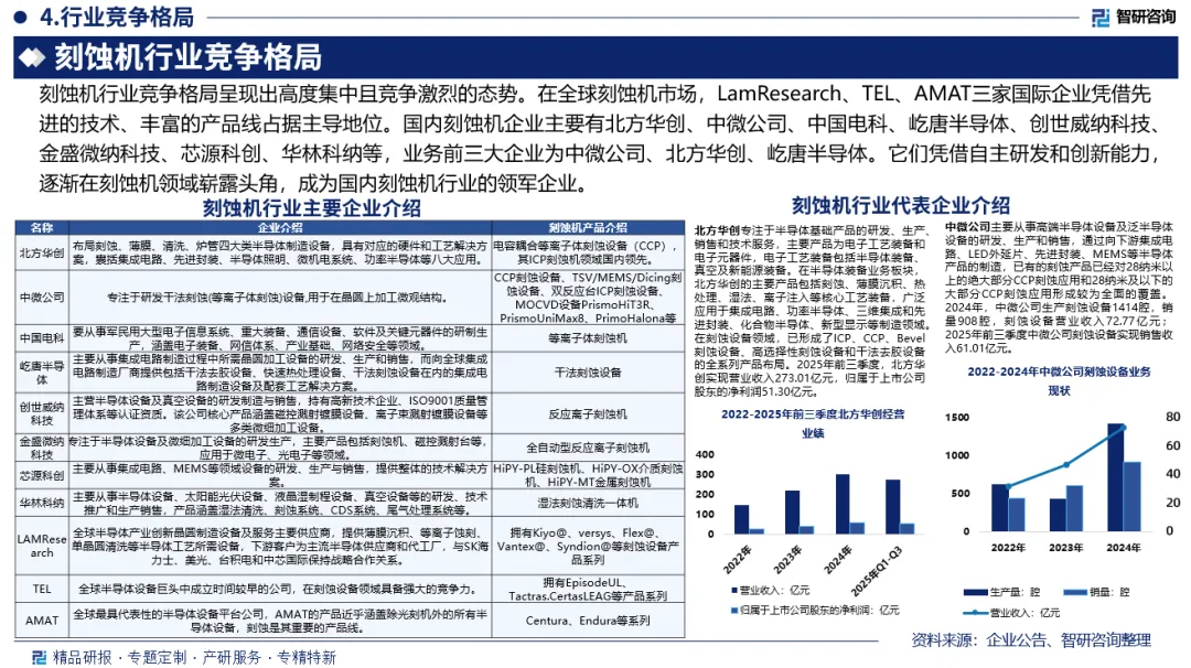 竞争情况:刻蚀机行业竞争格局呈现出高度集中且竞争激烈的态势。在全球刻蚀机市场,LamResearch、TEL、AMAT三家国际企业凭借先进的技术、丰富的产品线占据主导地位。国内刻蚀机企业主要有北方华创、中微公司、中国电科、屹唐半导体、创世威纳科技、金盛微纳科技、芯源科创、华林科纳等,业务前三大企业为中微公司、北方华创、屹唐半导体。