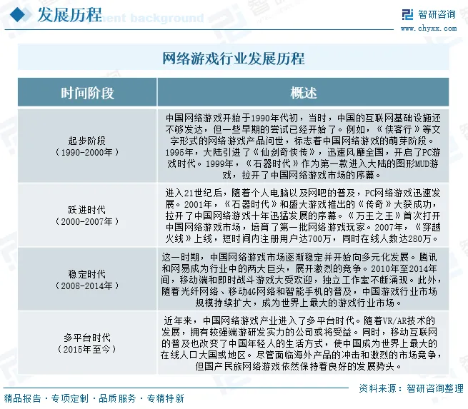 从发展历程来看,中国网络游戏可分为起步阶段(1990年-2000年)、跃进时代(2000年-2007年)、稳定时代(2008年-2014年)、多平台时代(2015年至今)。