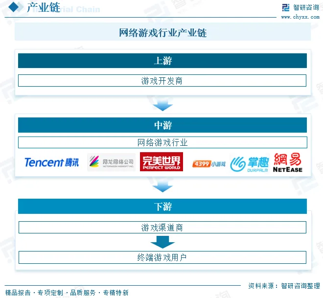 从产业链来看,网络游戏行业上游为游戏开发商,它是网络游戏产品开发的主体,包括游戏开发计划,组织策划、程 序、美术、测试等一系列工作,是游戏知识产权的拥有者,通过授权或者代理研发为用户提供网络游戏产品。中游是指游戏运营,是指搭建游戏上线运营的软硬件环境,为玩家提供网络游戏服务,通过道具收费、时间收费等模式获取运营收入的活动。下游是指游戏渠道商,它是介于游戏运营商和最终游戏玩家之间的中间商,包括信息、产 品、支付渠道及衍生品经营等相关服务渠道商。