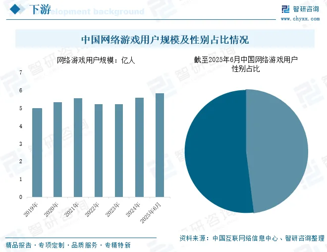 随着居民人均可支配收入的持续增长,人们对娱乐消费的意愿和能力显著提高。网络游戏作为重要的数字娱乐方式,其付费意愿和消费规模随之扩大,为用户规模增长提供了坚实的经济基础。同时,技术进步与基础设施完善也是我国网络游戏用户规模增长的重要因素。移动互联网的高速普及、5G网络的推广以及智能手机等移动设备性能的不断提升,极大改善了游戏的流畅度和体验感。同时,云游戏技术的发展降低了对硬件的依赖,使更多用户能够便捷地接入和体验高质量网络游戏,从而扩大了潜在用户群体。数据显示,截至2025年6月,我国网络游戏用户规模达5.84亿人,较2024年12月增长2692万人,占网民整体的52.0%。从性别来看,截至2025年6月,男性在网络游戏用户中的占比为52%,仍占据主导地位。但女性在网络游戏用户中的占比较2024年底提升3.1个百分点,上升趋势明显。