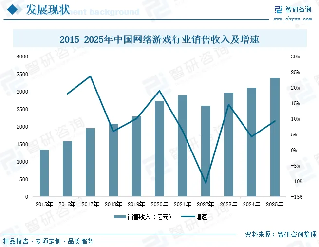 在数字经济与文化消费深度融合的当下,中国网络游戏行业正以技术为引擎、内容为内核,构建起覆盖全球的数字娱乐生态。从移动端到客户端,从虚拟世界到现实场景,网络游戏不仅重塑了娱乐消费模式,更成为推动文化传播、技术创新与产业升级的重要力量。近年来,我国各级各地政府出台多项游戏产业相关政策,如《网络游戏管理办法》《提振消费专项行动方案》《关于加快推进服务业扩大开放综合试点工作方案》等。这些政策的发布,有利于推动网络游戏出海、促进游戏跨界融合,以进一步保障网络游戏行业繁荣健康发展。此外,移动终端硬件与系统的不断升级,以及图像处理技术、网页技术等多种技术的发展与创新,使得网络游戏的开发技术水平得到不断提升。这也进一步加速网络游戏的发展。数据显示,2025年中国网络游戏行业销售收入达到3395.6亿元,同比上涨9.2%。