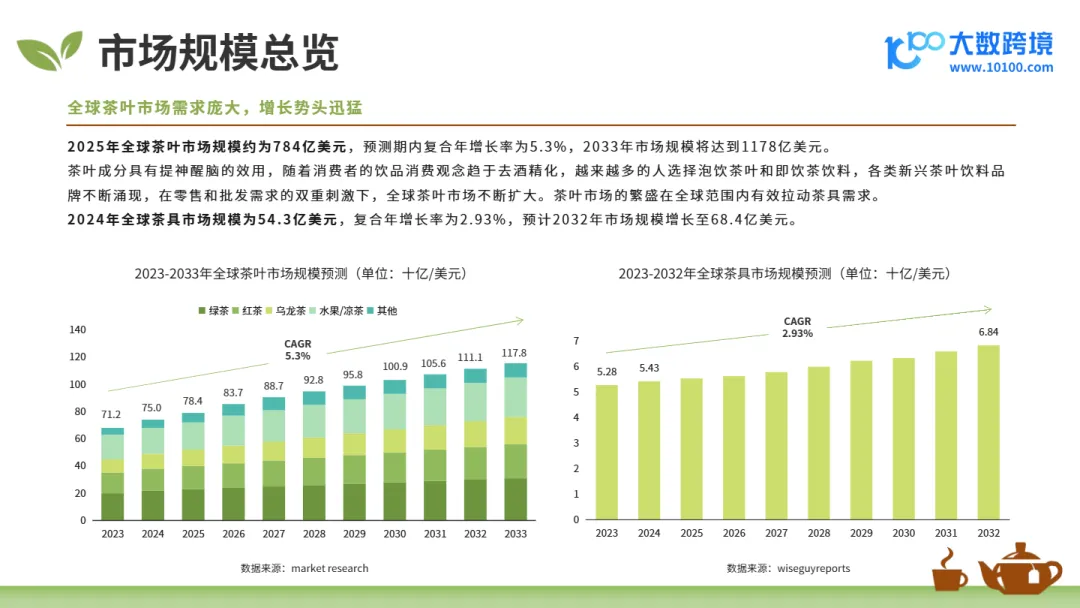 • 全球茶叶市场规模将突破千亿美金:2025年全球茶叶市场规模达784亿美元,CAGR为5.3%,预计2033年将增长至1178亿美元,其中红茶(251亿)、绿茶(152亿)为主流品类,即饮茶与功能性茶成增长引擎。