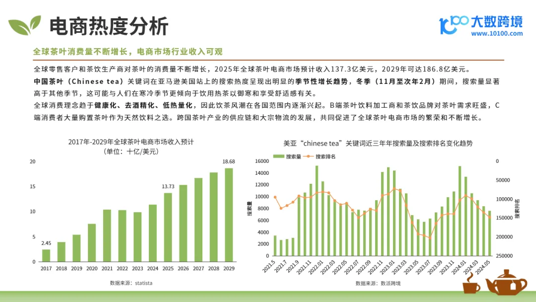应用场景:适用于制定2025年海外选品策略(如主推果味红茶、便携茶具)、优化独立站内容架构(增设茶文化教育板块)、策划社媒营销Campaign(结合健康功效与生活方式)、筛选高潜力目标市场(优先切入中东与东非)时作为核心决策依据。