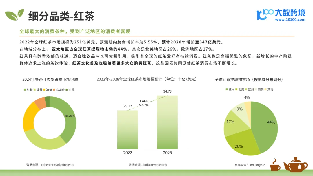 • 非洲与中东为增速最快的蓝海市场:该区域茶叶市场CAGR高达8.6%,2030年规模将达56亿美元;摩洛哥为中国茶叶最大出口国,阿联酋为全球人均茶叶消费最高国家,红茶为绝对主导品类,具备极高出海潜力。
