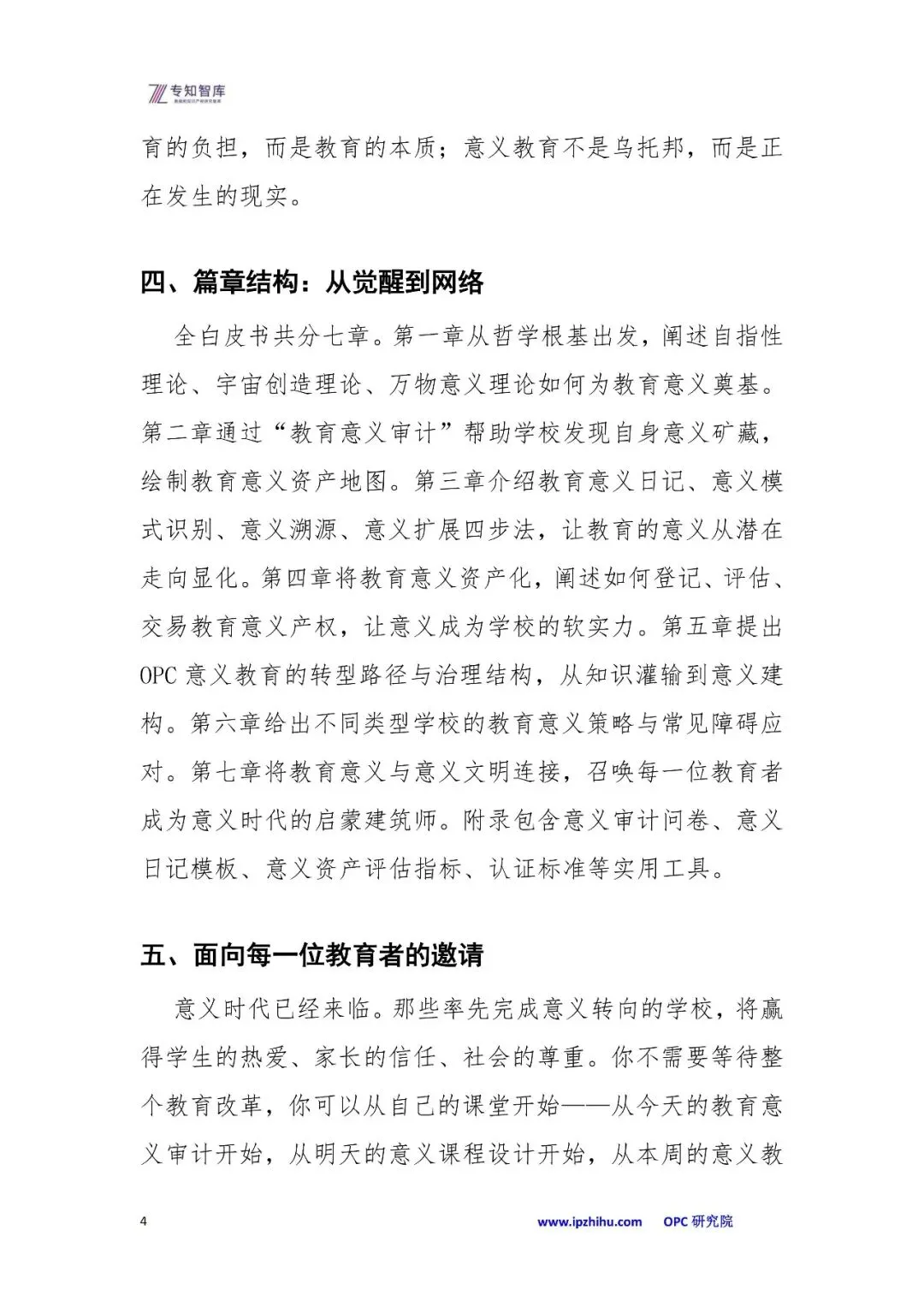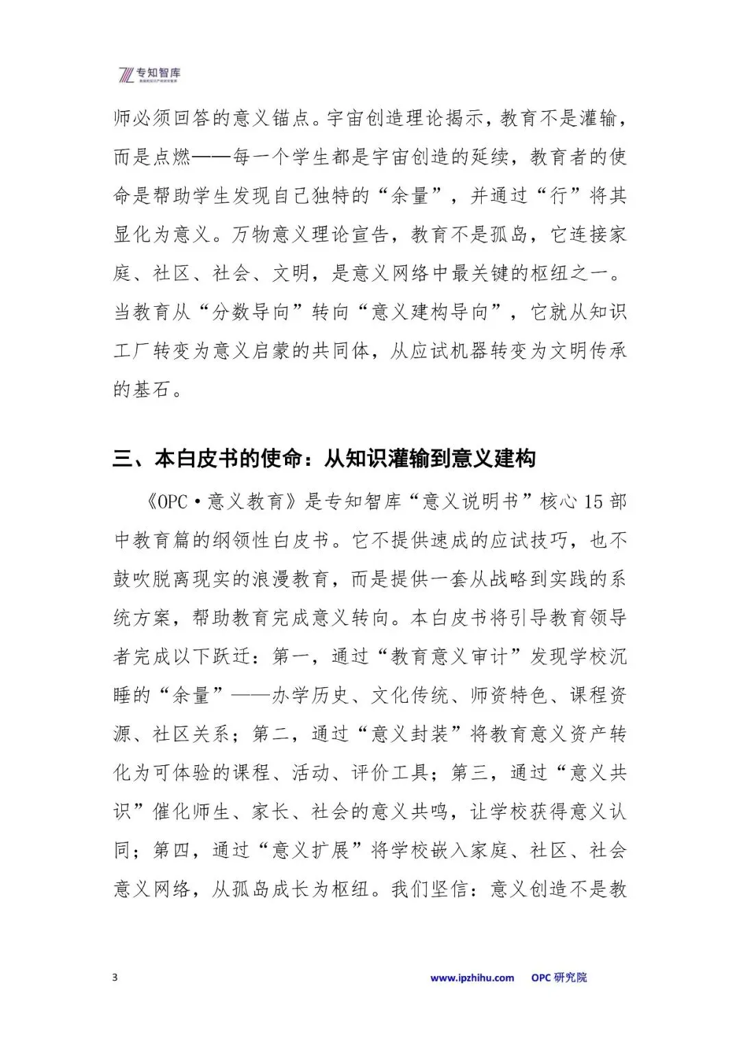 《OPC·意义教育》是专知智库“意义说明书”核心15部中教育篇的纲领性白皮书。它不提供速成的应试技巧,也不鼓吹脱离现实的浪漫教育,而是提供一套从战略到实践的系统方案,帮助教育完成意义转向。本白皮书将引导教育领导者完成以下跃迁:第一,通过“教育意义审计”发现学校沉睡的“余量”——办学历史、文化传统、师资特色、课程资源、社区关系;第二,通过“意义封装”将教育意义资产转化为可体验的课程、活动、评价工具;第三,通过“意义共识”催化师生、家长、社会的意义共鸣,让学校获得意义认同;第四,通过“意义扩展”将学校嵌入家庭、社区、社会意义网络,从孤岛成长为枢纽。我们坚信:意义创造不是教育的负担,而是教育的本质;意义教育不是乌托邦,而是正在发生的现实。