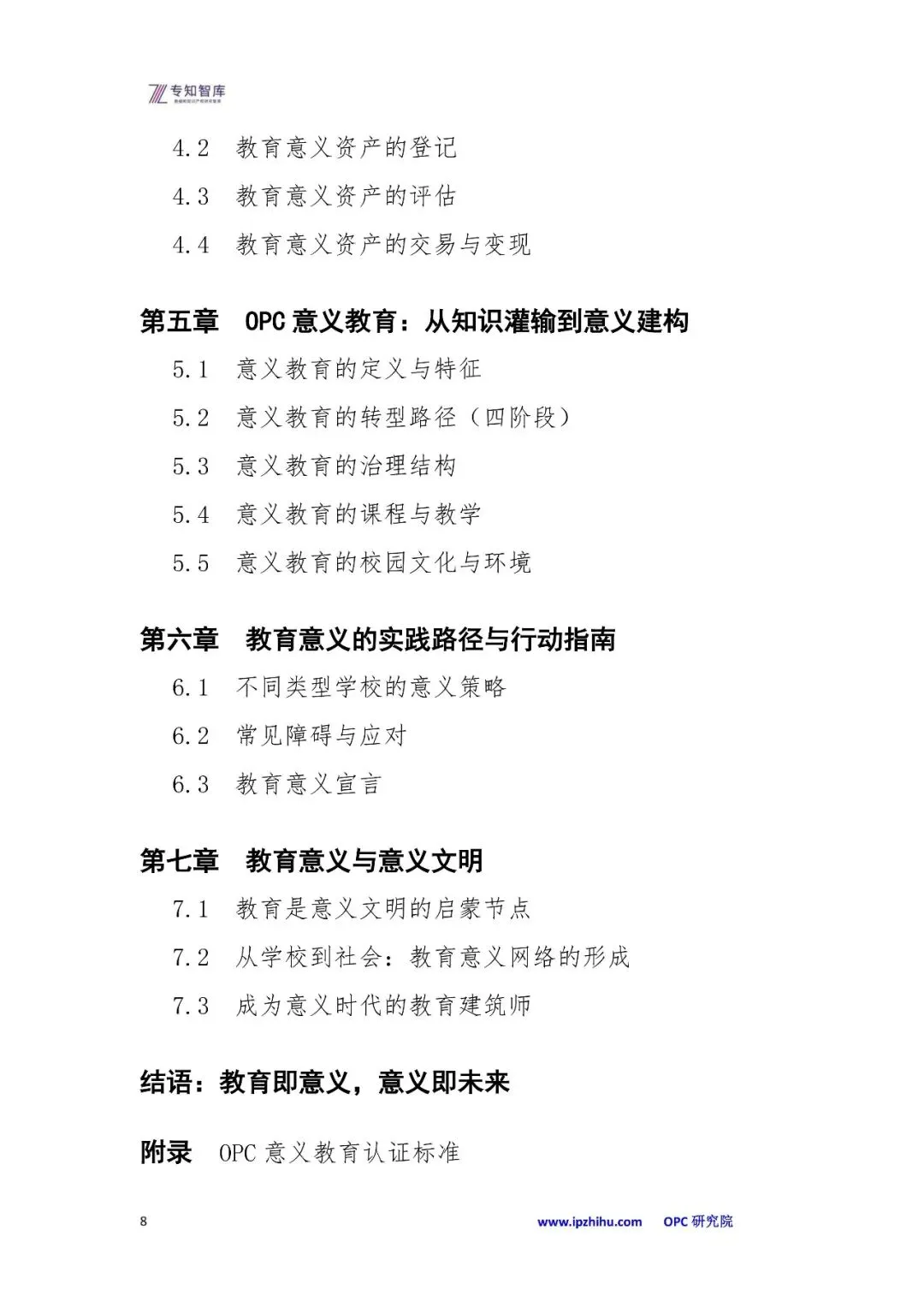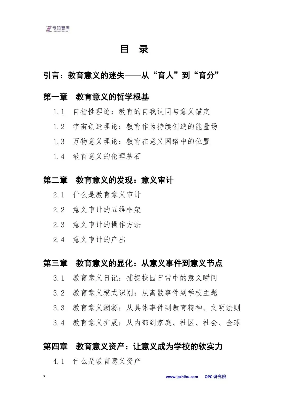 全白皮书共分七章。第一章从哲学根基出发,阐述自指性理论、宇宙创造理论、万物意义理论如何为教育意义奠基。第二章通过“教育意义审计”帮助学校发现自身意义矿藏,绘制教育意义资产地图。第三章介绍教育意义日记、意义模式识别、意义溯源、意义扩展四步法,让教育的意义从潜在走向显化。第四章将教育意义资产化,阐述如何登记、评估、交易教育意义产权,让意义成为学校的软实力。第五章提出OPC意义教育的转型路径与治理结构,从知识灌输到意义建构。第六章给出不同类型学校的教育意义策略与常见障碍应对。第七章将教育意义与意义文明连接,召唤每一位教育者成为意义时代的启蒙建筑师。附录包含意义审计问卷、意义日记模板、意义资产评估指标、认证标准等实用工具。
