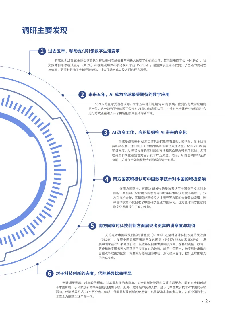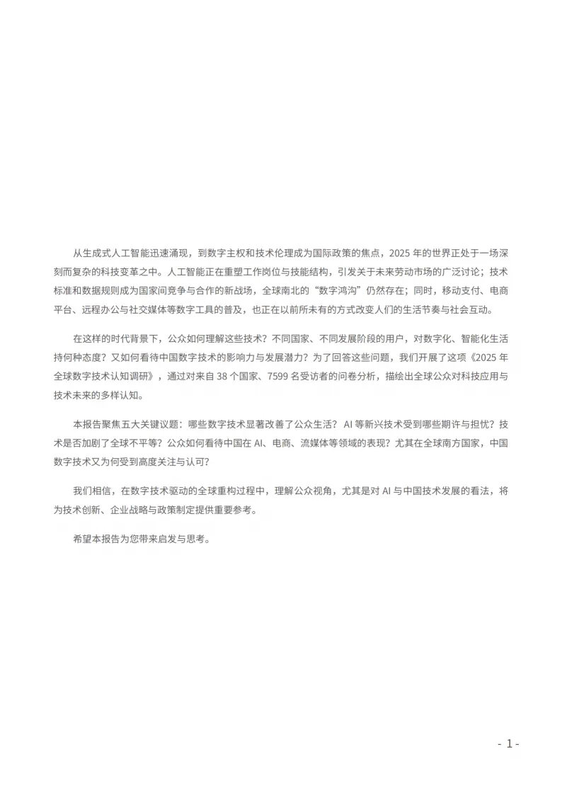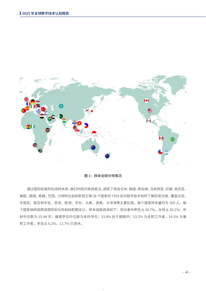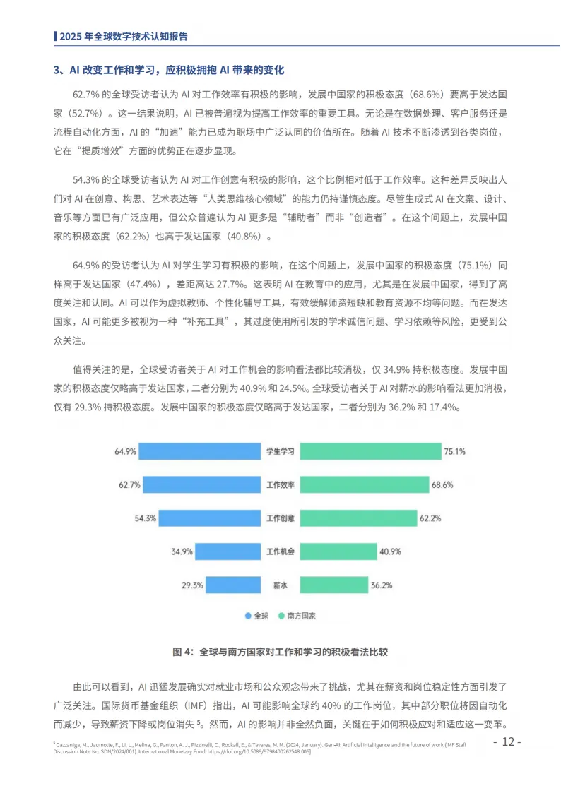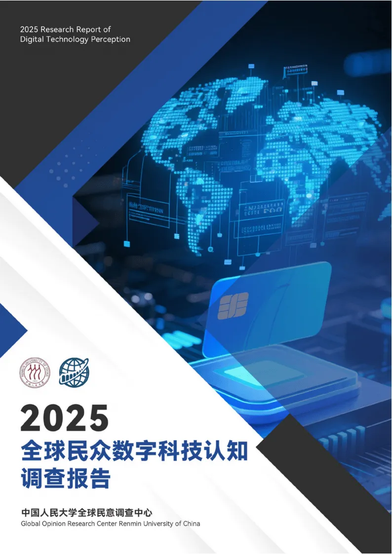 中国人民大学全球民意调查中心发布的《2025全球数字技术认知报告》,基于38个国家7599名受访者调研,呈现全球公众对数字技术的认知、态度及中国数字技术的国际影响力,揭示全球数字技术发展的核心趋势与格局。