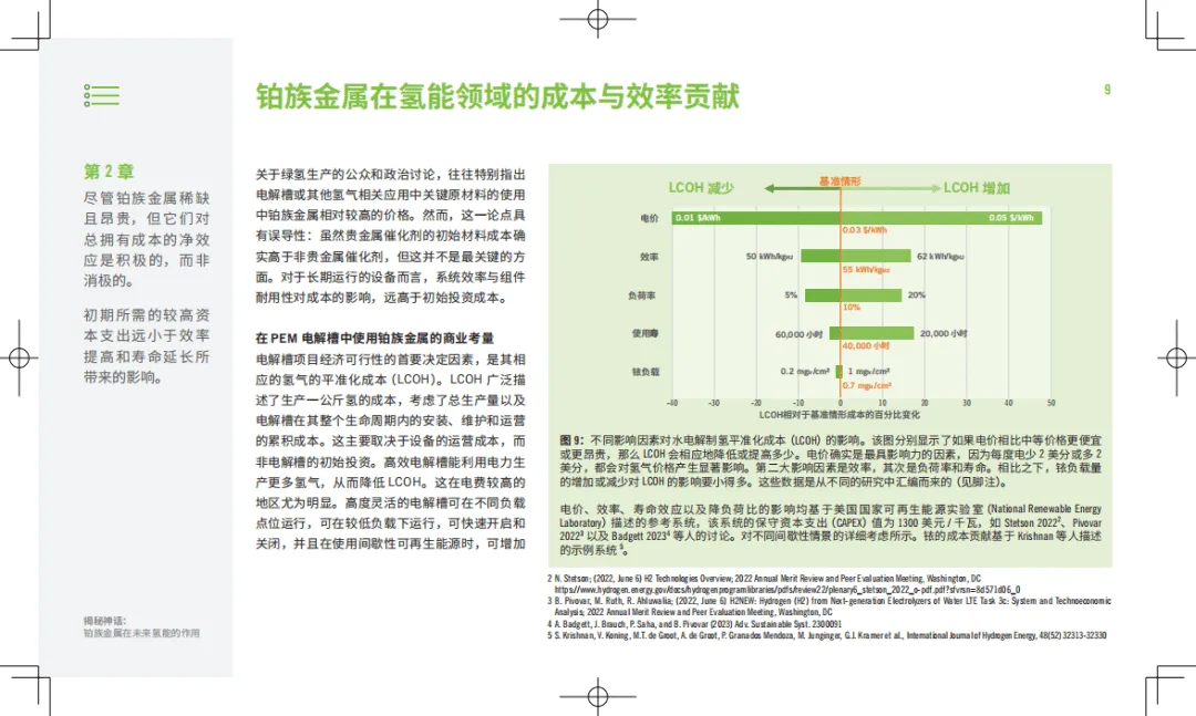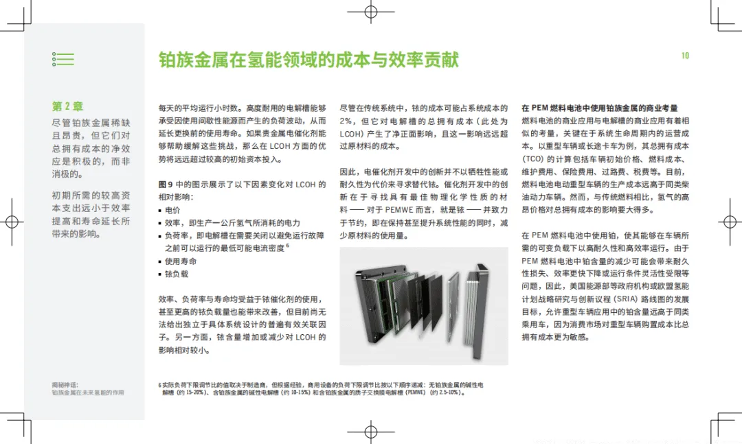 白皮书指出,铂族金属并非氢能产业的成本负担,反而能降低全生命周期成本。电解槽的平准化成本受电价、效率、寿命影响显著,铱等金属用量对成本影响极小,其带来的效率提升与寿命延长,远高于材料初始投入;燃料电池车辆的总拥有成本主要受氢气价格影响,铂载量变化的影响有限,铂族金属可保障设备在可变负载下高效耐用。