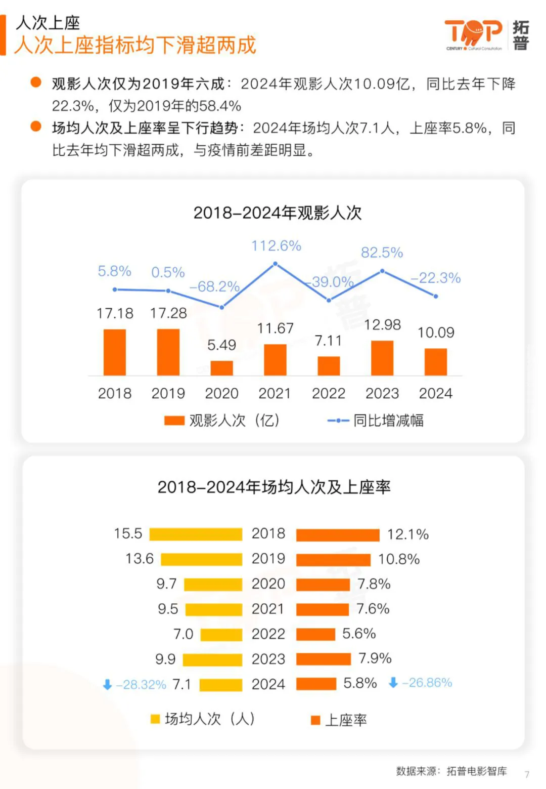 • 市场大盘同比下滑22.6%:2024年中国内地电影总票房为425.02亿,观影人次10.09亿,较2023年分别下降22.6%和22.3%,仅为2019年巅峰期的约70%,显示市场复苏乏力,内容吸引力不足。