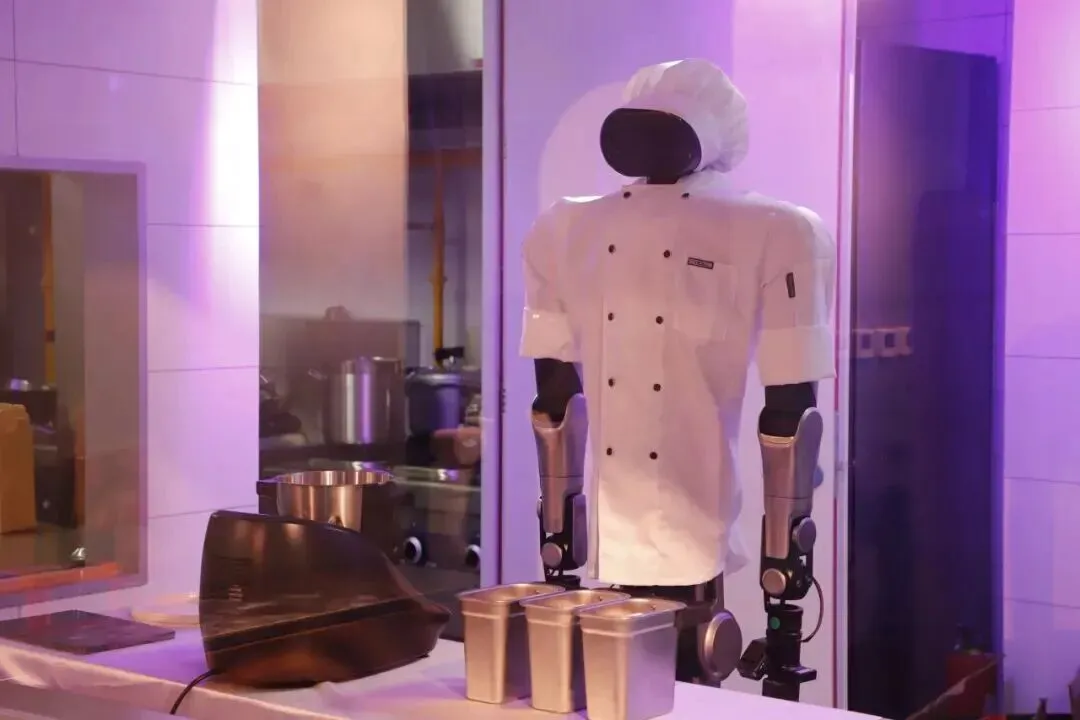 人类选手和人形机器人选手在同一条赛道上同时起跑,完成21公里的挑战。终点线旁,还有一家全流程由机器人服务的餐厅正在开业,机器人厨师炒红烧肉,机器人乐队现场演奏,人形机器人在台上表演,格莱美慢动作机器人帮你拍一段电影感大片。