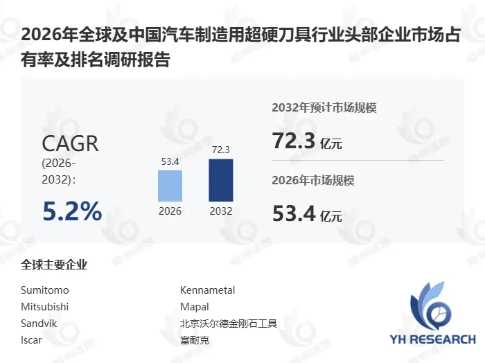 根据YH恒州诚思信息咨询调研统计,2025年全球汽车制造用超硬刀具市场规模约50.90亿元,预计未来将持续保持平稳增长的态势,到2032年市场规模将接近72.28亿元,未来六年CAGR为5.2%。