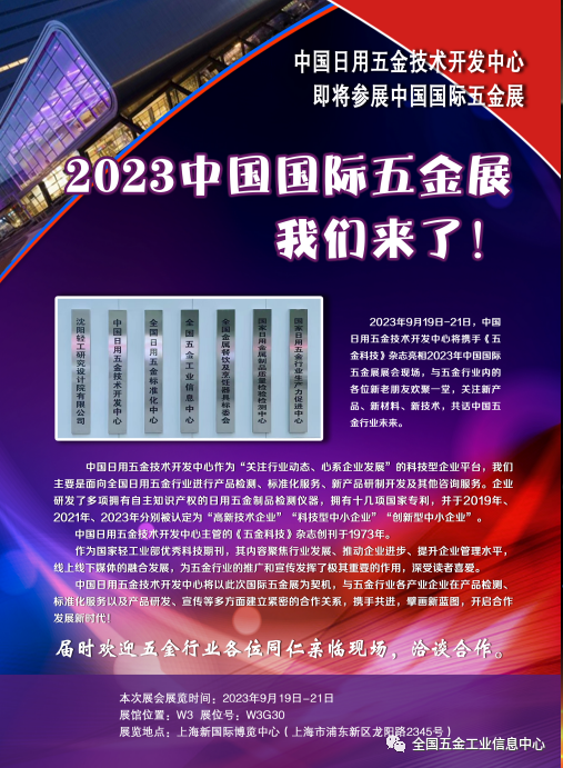 2023年9月19日-21日,中国日用五金技术开发中心将携手《五金科技》杂志亮相2023年中国国际五金展展会现场,与五金行业内的各位新老朋友欢聚一堂,关注新产品、新材料、新技术,共话中国五金行业未来。