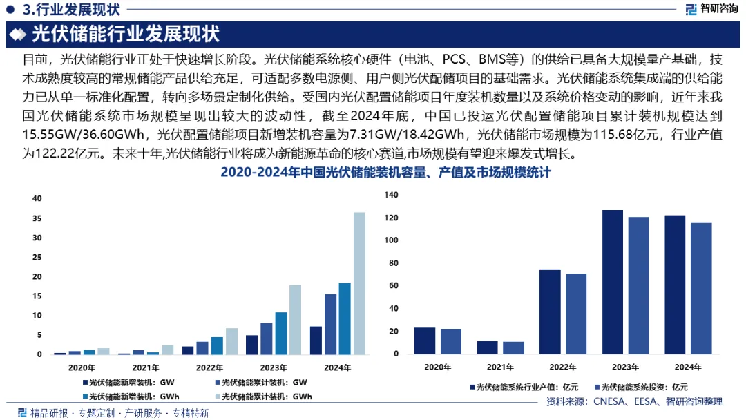 光伏储能即光伏储能系统,是一种将光伏发电与储能技术相结合的一种能源解决方案。目前,光伏储能行业正处于快速增长阶段。光伏储能系统核心硬件(电池、PCS、BMS等)的供给已具备大规模量产基础,技术成熟度较高的常规储能产品供给充足,可适配多数电源侧、用户侧光伏配储项目的基础需求。光伏储能系统集成端的供给能力已从单一标准化配置,转向多场景定制化供给。受国内光伏配置储能项目年度装机数量以及系统价格变动的影响,近年来我国光伏储能系统市场规模呈现出较大的波动性,截至2024年底,中国已投运光伏配置储能项目累计装机规模达到15.55GW/36.60GWh,光伏配置储能项目新增装机容量为7.31GW/18.42GWh,光伏储能市场规模为115.68亿元,行业产值为122.22亿元。未来十年,光伏储能行业将成为新能源革命的核心赛道,市场规模有望迎来爆发式增长。