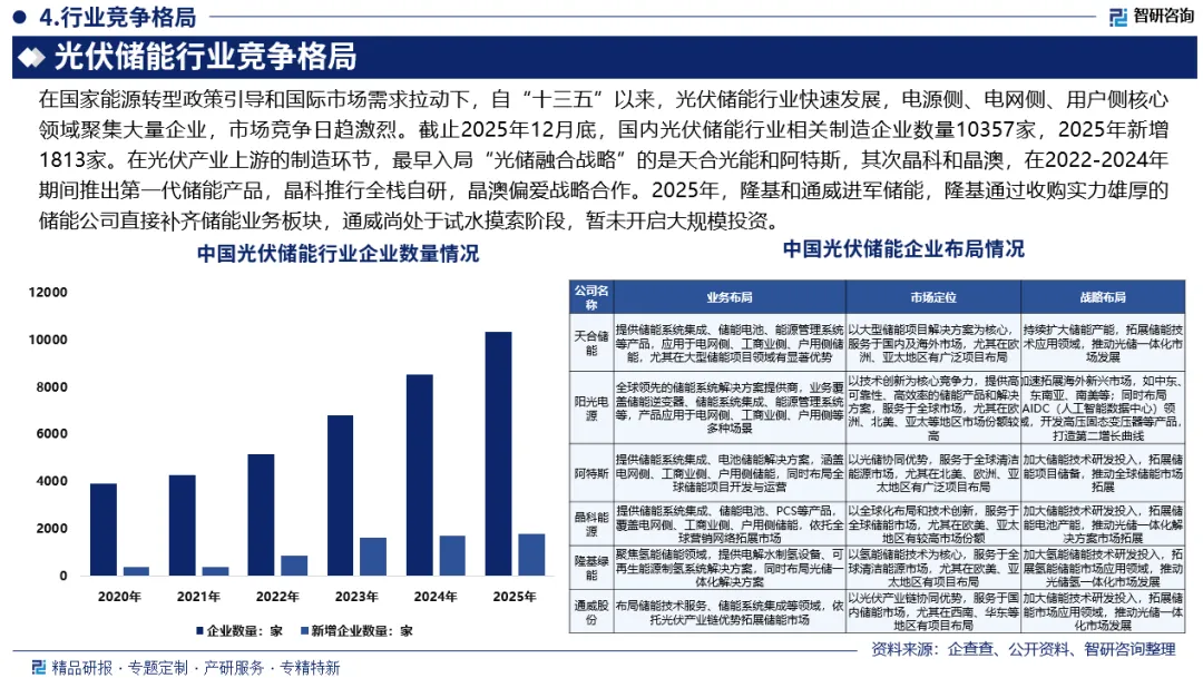 竞争情况:自“十三五”以来,我国光伏储能行业快速发展,电源侧、电网侧、用户侧核心领域聚集大量企业,市场竞争日趋激烈。在光伏产业上游的制造环节,最早入局“光储融合战略”的是天合光能和阿特斯,其次晶科和晶澳,在2022-2024年期间推出第一代储能产品,晶科推行全栈自研,晶澳偏爱战略合作。2025年,隆基和通威进军储能。
