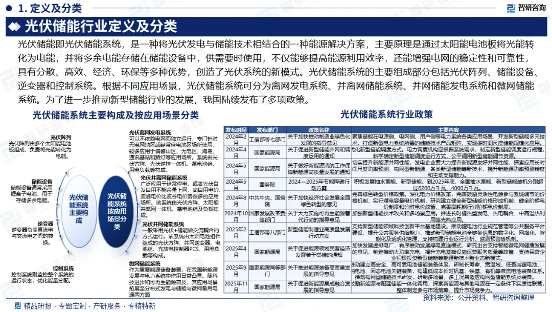 行业定义及分类:光伏储能即光伏储能系统,是一种将光伏发电与储能技术相结合的一种能源解决方案。光伏储能系统的主要组成部分包括光伏阵列、储能设备、逆变器和控制系统。根据不同应用场景,光伏储能系统可分为离网发电系统、并离网储能系统、并网储能发电系统和微网储能系统。