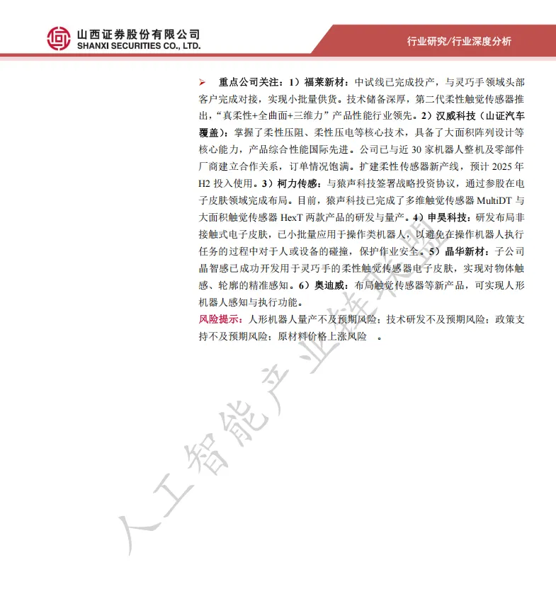 报告指出,压阻式是目前人形机器人领域的主流路线,能有效平衡工艺难度、成本与量产能力。特斯拉、汉威科技、福莱新材等企业均在此方向布局。