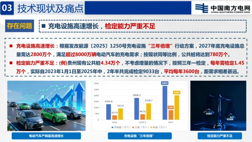 在双碳战略与充电设施“三年倍增”行动推动下,我国新能源汽车与充电桩规模快速扩张,预计2030年新能源汽车保有量达1-1.6亿辆,车桩比目标为1:1。贸易结算类充电桩被纳入强制检定与周期检定范围,需遵循相关国家计量检定规程,现有现场逐台检定模式已无法适配行业发展需求。