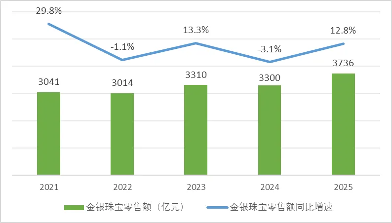2025年,我国限额以上单位金银珠宝类零售额3,736亿元,同比增长12.8%,显著高于过去5年同期8.6%的平均增速,在国家统计局监测的16类限额以上单位商品中的位次由上年同期的末位跃升至第5位,显示出较强的修复弹性与增长韧性。