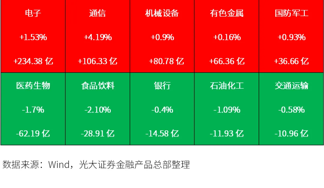 从两市行业板块资金流向来看,电子、通信、机械设备、有色金属、国防军工等净流入排名靠前;医药生物、食品饮料、银行、石油化工、交通运输等净流出排名靠前。