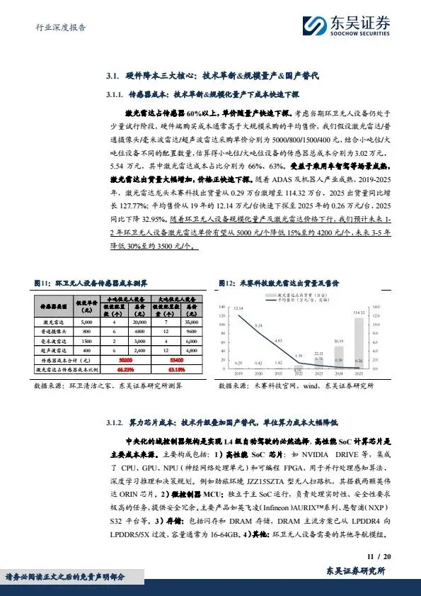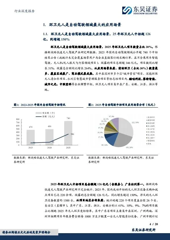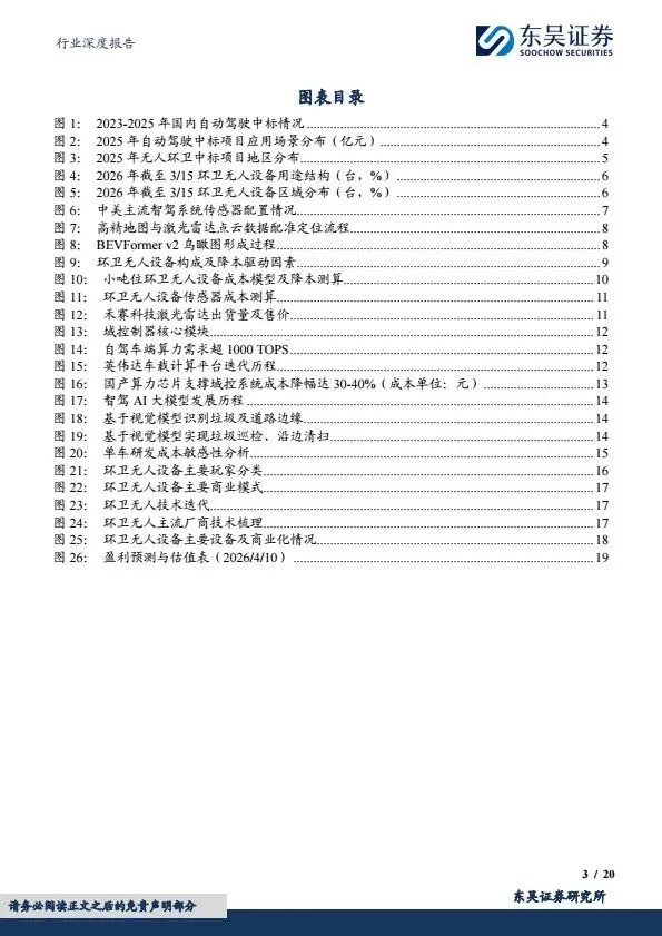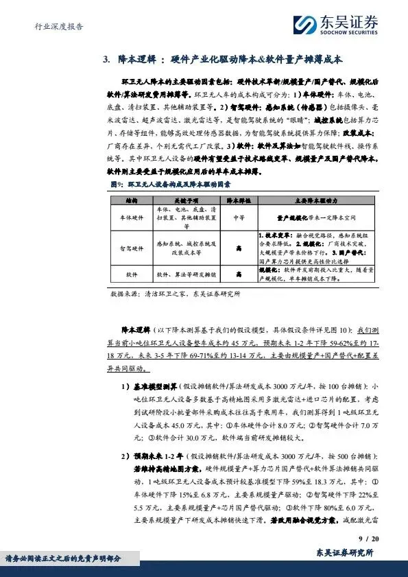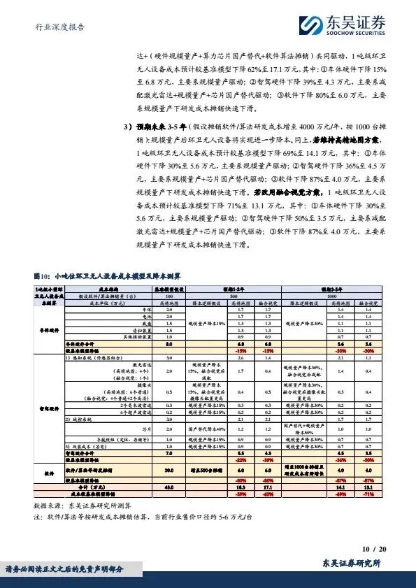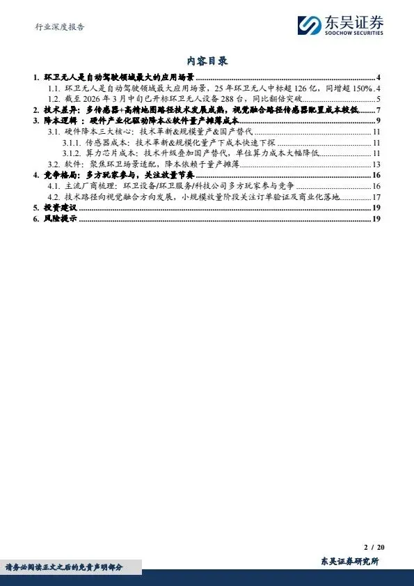 摘要:环卫无人化是自动驾驶最大落地场景,2025年中标金额超126亿元(同比+150%),2026年Q1设备开标量同比翻倍。行业形成多传感器+高精地图、视觉融合两大技术路线,后者硬件成本更低。当前小吨位无人车成本约45万元,预计1-2年降至17-18万元,3-5年降至13-14万元,核心由规模量产、国产替代、软件摊销驱动。竞争格局涵盖装备、服务、科技三类厂商,盈峰环境、酷哇科技领先。行业2026-2027年迎放量期,建议关注劲旅环境、宇通重工、福龙马、玉禾田、盈峰环境、侨银股份。