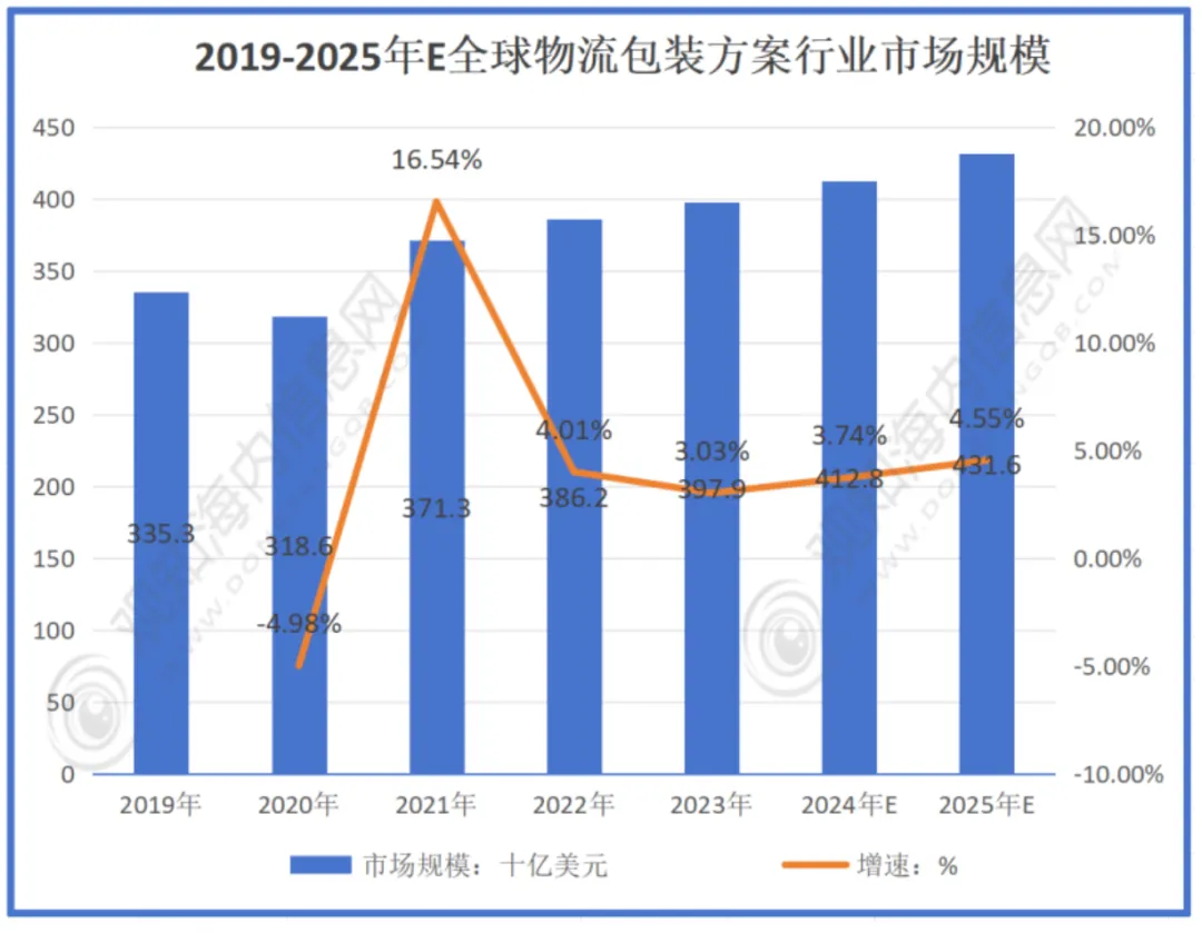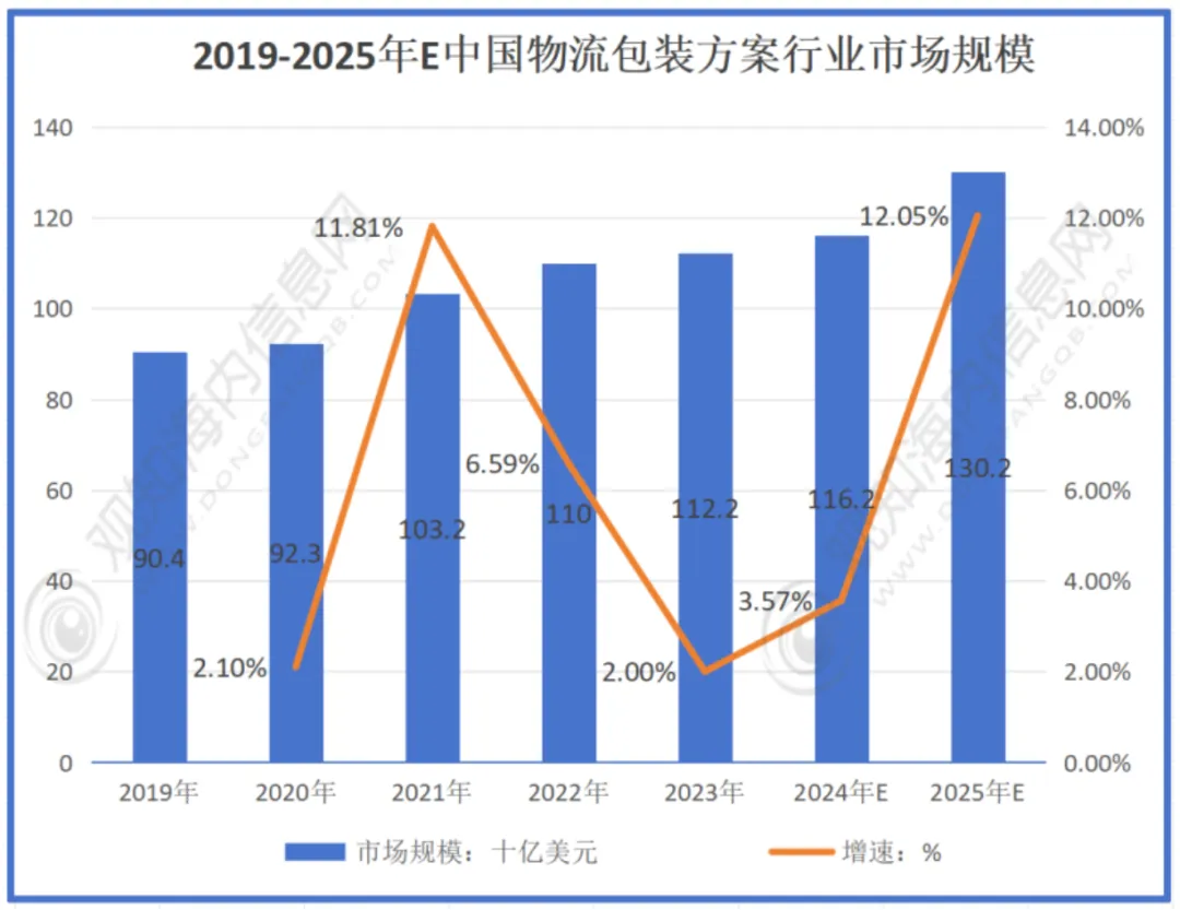 从整体物流包装方案市场来看。据华经产业研究院数据,2023年全球物流包装方案市场规模约3979亿美元,中国约1122亿美元。中国物流包装行业已形成完整产业链,2025年中国物流包装方案市场规模约为1302美元。
